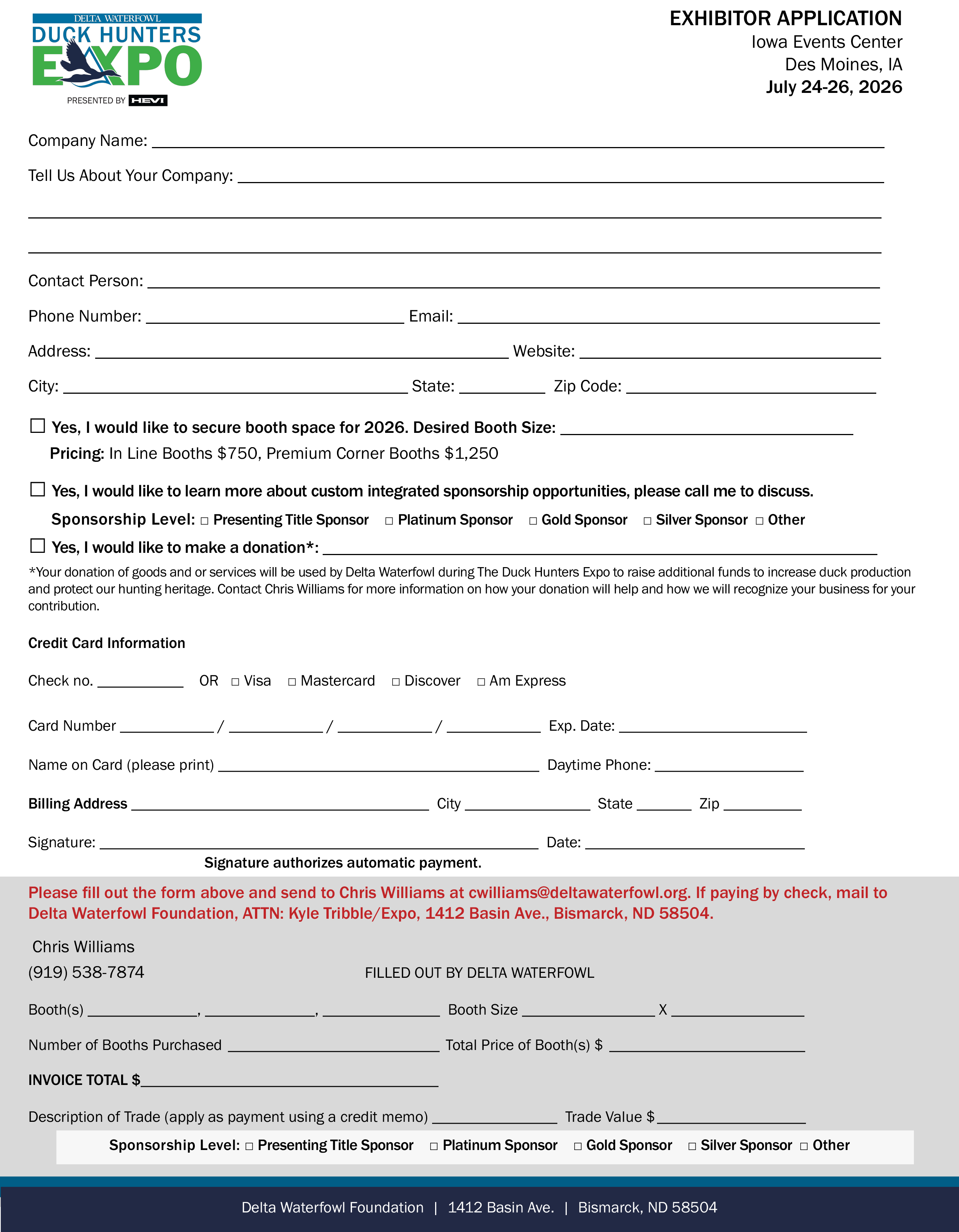 Companies interested in exhibiting or sponsoring the 2026 Duck Hunters Expo should complete the printable Exhibitor Application below.
