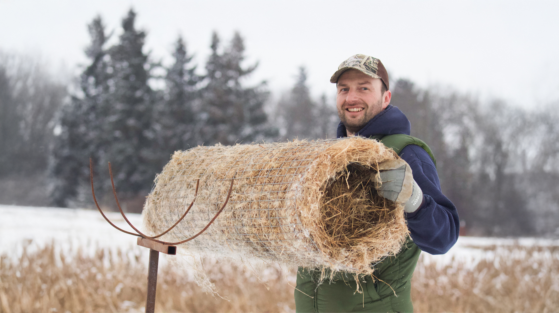 5. Spread approximately 2” of flax straw (or equivalent) on remaining 4’ of fencing, then continue to roll tightly. Hog ring end of fencing to complete the Hen House, providing an 11-12” diameter opening on each end. Try not to exceed 12” as Canada geese may use larger Hen Houses.
