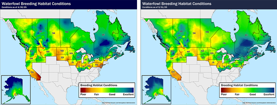 Delta’s habitat conditions maps from the three most critical months for duck production tell the story. April began with a moisture deficit, worsened by poor snowmelt that failed to recharge key wetland areas in the Dakotas and southern Manitoba. And although May brought hopeful signs in some areas, June’s widespread heat, wind, and lack of rainfall largely erased that promise.