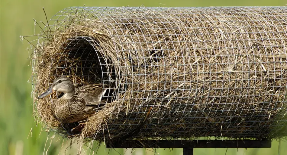 The Delta Hen House is a nesting structure used nearly exclusively by mallards. The cylindrical structure mounted on a steel pole several feet about the surface of water in a permanent or semi-permanent wetland puts the nest, hen, and clutch of eggs out of reach of most mammalian meso-predators. These Hen Houses are highly effective—often giving a hen mallard using a Hen House up to a 12 times greater chance of nest success than a hen nesting on the ground in nearby upland cover.